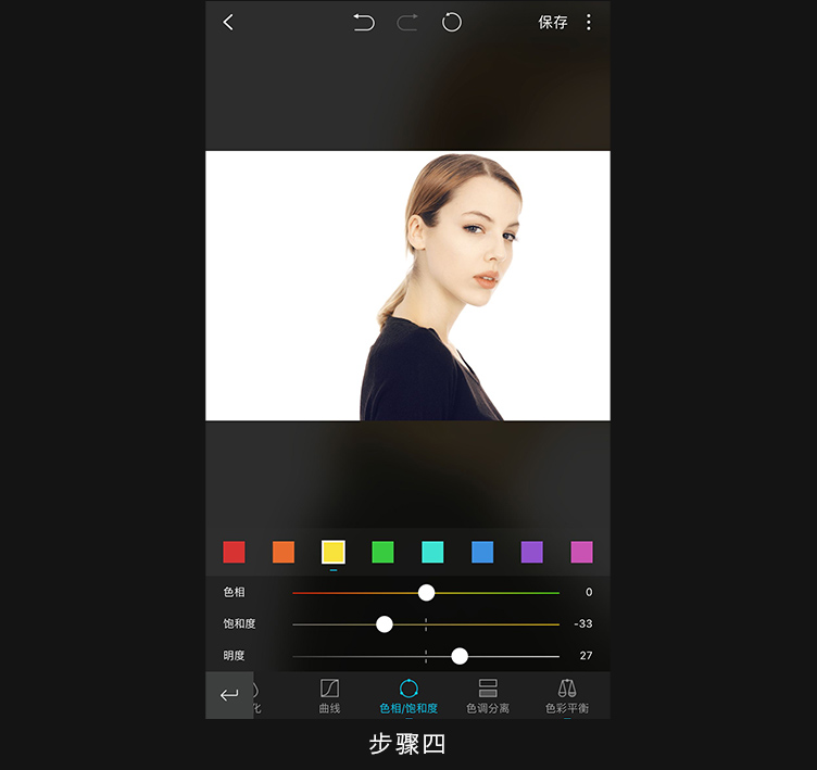 步骤四:使用【色相/饱和度】工具,针对皮肤黄色,适当降低饱和度、提高明度,使得皮肤看起来更加白净。