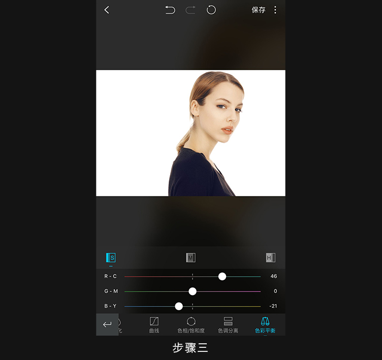步骤三:使用【色彩平衡】工具,添加衣服暗部冷色调,使整个照片色彩倾向更加均衡。